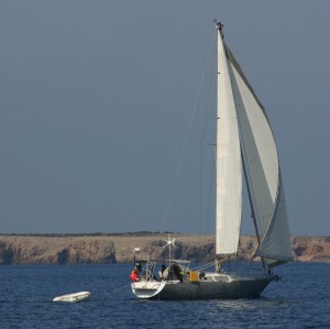Con las dos velas a tope de palo y un viento de 25 nudos de Sur comenzamos una larga ceñida hacia la segunda isla más grande del Mediterráneo. Tenemos algo de ola de través, pero navegamos rápido y no nos es molesto. Surfeando una de éstas olas, vemos tres grandes delfines que se dirigen hacia nosotros, dos pasan de largo y el tercero se queda unos segundos nadando a nuestro través, mide unos tres metros, que descanso nos queda cuando sigue su rumbo y se une a sus amiguetes, era muy grande….