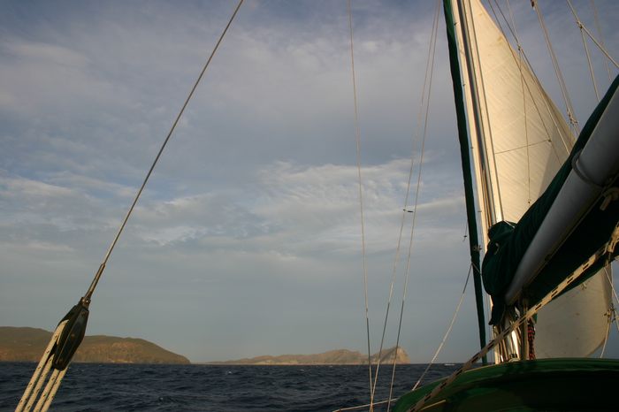A las 4 de la noche el viento deja de llevarnos y tenemos que ayudarnos con el motor. Ha sido una ceñida de 120 millas en 22 horas (una media de 5,5Kn, con picos de 7 por la noche). Suerte que al día siguiente, con la salida del sol, volvemos a tener viento.
