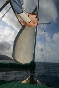 dormiremos y Luni saldrá solo a navegar)Desayunamos rápido antes de que el tiempo se ponga duro y salimos rápido, tenemos que ayudar a las velas con el motor para escapar de forma segura. Una vez nos esncontramos a distancia prudencial, imbuidos por un espíritu marinero (y también por el precio del diesel en esta zona) apagamos el motor y comenzamos con la letanía de bordos para ganar Sur… A cada bordo, más viento, más ola y otro rizo que cae. Cuando no nos queda más que rizar enrollamos génova y establecemos trinqueta, algo más cómodo