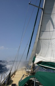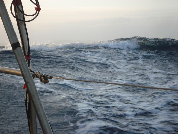 Por la radio y en el NAVTEX, a diferencia de en política, Italianos, Franceses y Argelinos se ponen deacuerdo en algo, aviso de borrasca de NW fuerza 7…. Trasluchamos para ponernos a resguardo del cabo y acabar con este festival cuanto antes, estamos navegando a 7 nudos sólo con la trinqueta (que no nos atrevemos a trimar correctamente) y las olas entre dos y tres metros por la aleta de babor.