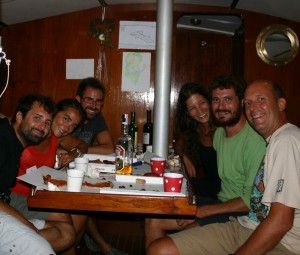 sus tripulantes Joan, Joan y acompañándolos Eva y Joan Vicenç en ese tramo. Son de Palma de Mallorca y llevan más de un año recorriendo el Mediterráneo y ahora se encuentran en el viaje de regreso. Acabamos cenando unas fantásticas Pizzas en el barco regadas con buen vino y risas, al día siguiente repetiremos.