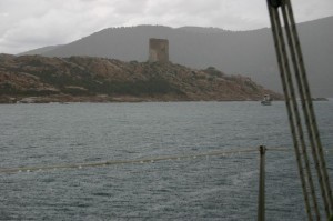 sospechoso. Con todas las extremidades intactas salimos del fondeo a vela y navegamos resiguiendo la costa hasta fondear delante del puerto de Teulada, el fondo nos es muy bueno y el ancla agarra al segundo intento…. Bajamos para comprar algo en el super de un camping que hemos visto desde el mar, no tienen mucha cosa fresca!!! que pena, ayer comimos el último tomate. Aprovechamos para pasear hasta una torre de vigía, la isla está llena de ellas para protegerse de los piratas berberíscos y otros corsarios.