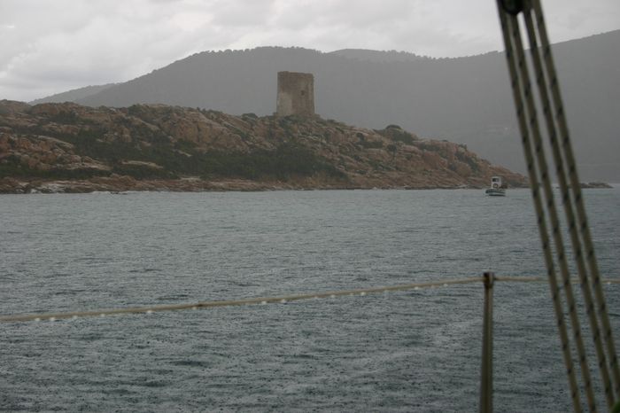 Por la radio y en el NAVTEX, a diferencia de en política, Italianos, Franceses y Argelinos se ponen deacuerdo en algo, aviso de borrasca de NW fuerza 7…. Trasluchamos para ponernos a resguardo del cabo y acabar con este festival cuanto antes, estamos navegando a 7 nudos sólo con la trinqueta (que no nos atrevemos a trimar correctamente) y las olas entre dos y tres metros por la aleta de babor.Pasamos entre Isola de la Vaca y Capo Sperone (sur de I. Antioco), intuimos los bajos por las explosiones de espuma que vemos entre las olas que han reducido en algo su tamaño, no el viento. Un par de millas por delante nuestro navega un ketch rojo que se debe conocer la costa ya que va muy pegado a ella, se dirige a una pequeña cala, nosotros también arrumbamos hacia allí. Cuando estamos cerca nos parece un lugar seguro para lanzar el hierro, todo lo seguro que se puede estar de cara a una pared colgados de un ancla y 40 metros de cadena aguantando rachas de 35 nudos de viento.