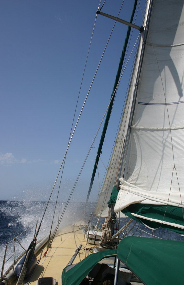 A las 6:30 comienza a salir el sol y estamos llegando al Cabo, izamos la trinqueta para recibir el viento por estribor y así darle resguardo, la carta marca bajos y con estas olas mejor dejar distancia. Estamos navegando a 6 nudos alejándonos del cabo, llevar el timón cada vez se hace más difícil y cuando nos coge una ola grande corremos mucho.