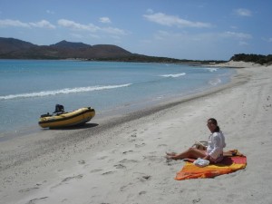 emos tiempo de relaciones sociales. Estamos en Porto Zafferano.1 de Septiembre. Nos despertamos un día soleado, nos hemos permitido ser algo gandules, en una playa solitaria y preciosa, los diseñadores del caribe la copiaron cuando montaron el chiringuito tropical, pero esta es la auténtica. Recibimos la visita de Paco que viene desde el cata a nado, charlamos un rato pero ellos deben partir para acompañar a unos familiares que han estado navegando con ellos al aeropuerto. Por la tarde bajamos a la playa a pasear, todo es idílico pero hay algo que intimida y nos recuerda porque estamos sólos en la playa y es que algunos siempre tiene que ir por