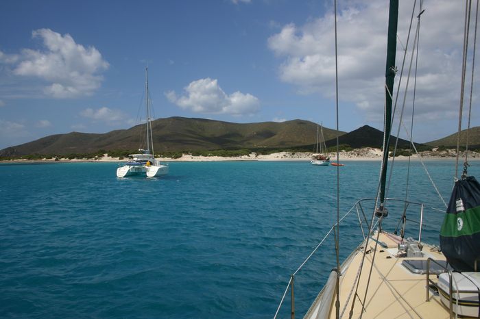 dado a casi todos los vientos… De camino al Norte descubrimos unos mástiles escondidos detrás de las rocas dónde está el Faro de Mangiabarca. Nos acercamos y vemos que está resguardado de la ola. Arriamos el poco trapo que llevábamos y haciendo trabajar al pobre Volvo de 40CV remontamos un viento de 35 nudos a unos tristes 3. Vemos fondo de arena a 5 metros en un sitio muy bonito y con un par de veleros y alguna motora fondeados. Tiramos 30 metros de cadena que al momento queda tensa como cuerda de violín, aguantará?????? Buceamos y parece que ha cogido bien, después de tres horas de navegación y con más sal en el cuerpo que un bacalao noruego nos preparamos la comida y a descansar.