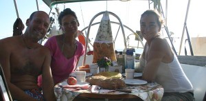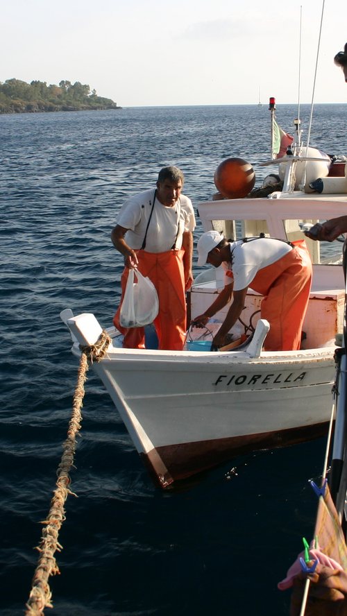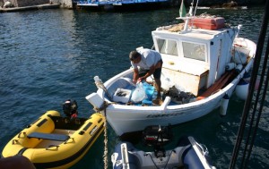 De regreso a Lune de Miel encontramos al pescador de Lipari y ya que no hemos pescado nada le compramos tres dorados para la cena.