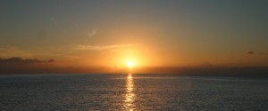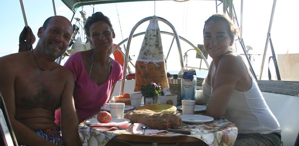 Mientras estamos cenando aparece velero que fondea entre la playa y nosotros otro velero, al rato se nos acerca un dinghy, que sorpresa, acaban de llegar Jessica y Roy que nos invitan a desayunar mañana por la mañana. La mañana del 18 nos despertamos pronto, el espectáculo promete, tenemos delante a Stromboli, Panarea y Salina, según como borneamos también Lípari (Vulcano queda escondida) y el Sol saldrá entre ellas!!! Después de ver el amanecer nos vamos a desayunar al Tetamanu, desayuno continental, increible, tostadas, tortilla con bacon y jamón, café, te, pastas….. Luego nos vamos a recoger piedras volcánicas a la playa y a pasear por el pueblecito, no nos podemos bañar, hay unas medusas muy bonitas de color rosa y largos tentáculos, y otras de marrones que según los locales no pican…. nosotros no lo probaremos. Aprovechamos la excursión por tierra para comprar cuatro cosas en el super local y tirar la basura.