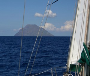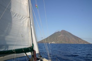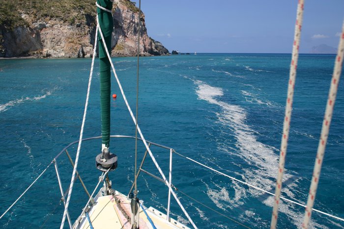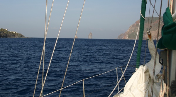 Levamso ancla y salimos hacia Panarea, la brisa refresca un poquito y nos ponemos a navegar a 6 nudos sobre un espejo que refleja todas las islas que tenemos a nuestro alrededor. Tiramos la linea de pesca y cuando estamos cerca de nuestro destino, como andamos rápido, decidimos continuar hasta Stromboli. De golpe la caña comienza a sonar, algo ha picado, nos giramos y vemos que llevamos cogido al sedal un Occeanis 44 de color azul, Roy nos ha cruzado por la popa y se ha enganchado… hacemos un par de maniobras y conseguimos desliar el tema. Con la maniobra perdemos el barlovento de Panarea y nos quedamos desventados a su Oeste, nos ayudamos del motor para escapar. Volvemos a navegar a 6 nudos y la inmensa mole del Stromboli cada vez se hace más grande delante nuestro y se ve humear…. El sedal vuelve a sonar, comenzamos a cobrar hilo y de golpe unas pequeñas gaviotas grises revolotean encima de nuestra captura hasta que una se queda enredada, desventamos la vela para no hecerle daño, cuando lo tenemos a bordo lo desliamos y el en agradecimiento me pica repetidamente las manos. Finalmente salta al mar y marcha, hoy no cenamos ni pescado ni pollo….