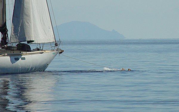 profundidad se han sumado a las vacaciones del piloto, ya no tenemos instrumentos en cubierta, preparamos la sonda manual para cuando lleguemos a Cefalú, suerte que conocemos el fondeo, esperamos llegar de día. Salimos entre Vulcano y Lípari, nos acercamos a dos grandes gendarmes (supongo que por aquí se les llamará carabinieri) y cuando tenemos suficiente resguardo para dejar Vulcano por sotavento arrumbamos hacia Sicilia, el viento ya esta a 25 nudos (suerte que el ventimetro es de mano y va a pilas…) Fantásticas vistas de las Eolias que van quedando lentamente por popa. Cuando nos acercamos a Sicilia el viento para por completo y tenemos que poner el motor para llegar de día, navegamos lentamente disfrutando de la vista cuando nos rodea un grupo de unos 30 delfines que nadan en círculos y saltan alrededor del barco, paramos motor y ellos se quedan. Salto al agua con las gafas, primero marchan algo asustados (no me extraña, todavía debo oler a infierno), les oigo bajo el agua y poco a poco se acercan y nadan a unos 10 metros por debajo mío y también por detras, ESPECTACULAR!!!!. Fondeamos en Cefalú sin problemas justo antes de que se ponga el Sol.