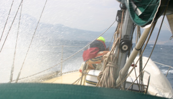 Cuando vovemos la vista a la proa vemos a una milla por delante nuestro un montón de borreguitos (indica que ahí el viento está como mínimo a 20 nudos) que corren perpendiculares al viento que tenemos nosotros, eso no está escrito en ninguno de nuestros libros de meteo! tenemos el tiempo justo de enrollar el génova y meter tres rizos a la mayor, el tormentín (que estrenamos hoy) lo subimos ya saltando olas con un fuerte viento de sur que además está muy caliente, por el valle de Términi