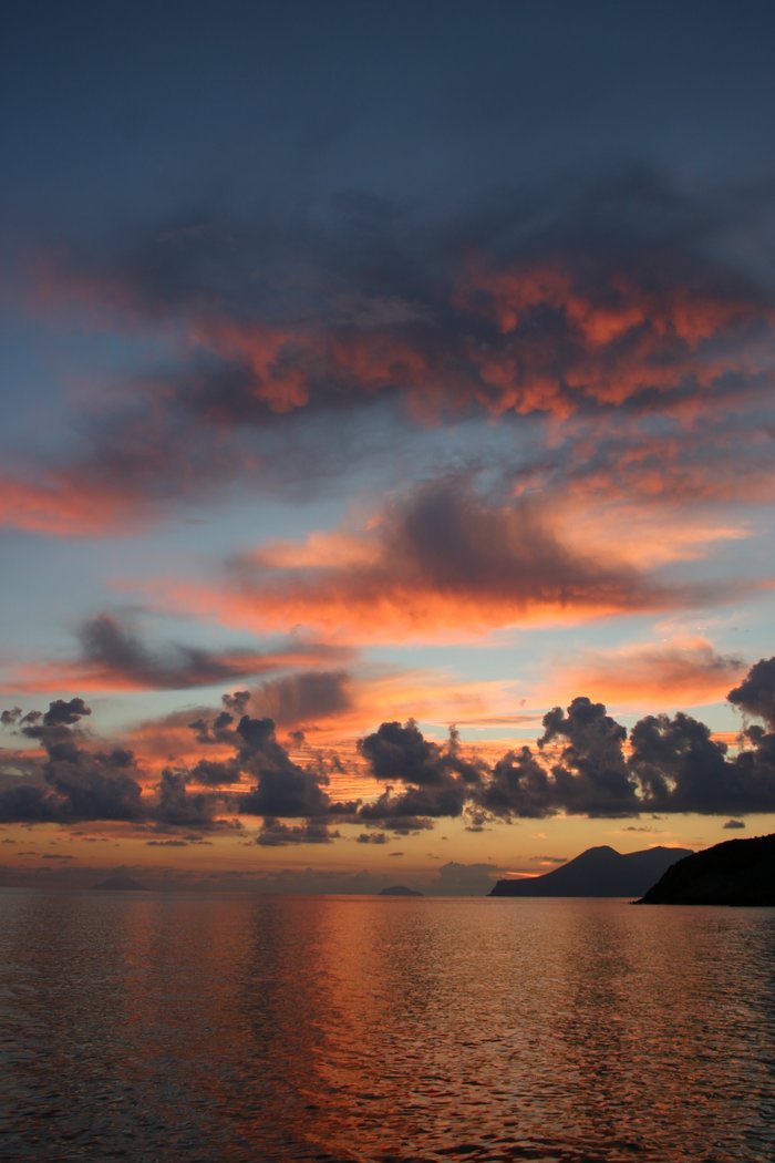 completamente negro, me zambullo para ver el fondeo y sorprendentemente el fondo es de arena, sólo que negra, completamente negra. Avisamos a Roy y Jessica del fondeo que hemos encontrado y cenamos. Después de la puesta levamos ancla y nos dirigimos a la Sciara di Fuco para verla a oscuras. Espectáculo increible, cada 15min una explosión que ilumina de rojo la nube de gases que emana el Volcan. Nos quedamos dos días visitando el pueblo y San Vincento. Los dos son de pequeñas casas blancas y con vehículos eléctricos, una preciosidad.