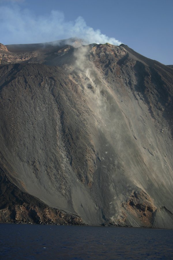 Por la tarde llegamos al sur de la Isla, el Tetamanu tisa su ancla y cuando nosotros llegamos vemos que está entre rocas y muy cerca de la pared, además no se ve el crater. Como nos quedan un par de horas de sol, continuamos para ver la Sciara di Fuoco. Desde el mar se ven las explosiones y entendemos por que no dejan acercarse a la costa, vemos caer las rocas y salpicar. Continuamos bordeando la isla hasta llegar delante de San Bartolomé donde tiramos el ancla a un mar
