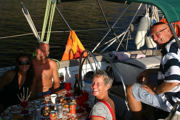 continúa hasta los 500m de profundidad. Nos pegamos a la pared y dejamos caer el ancla que encuentra fondo a 15 m sobre piedras y algas, cada vez los fondeos son más precarios. Botamos los dinghy’s, merienda todos juntos en Lune de miel (tapas con provolone y frankfurt, palitos de prosciuto, cervecita fresca y algún resto más que encontramos en la nevera