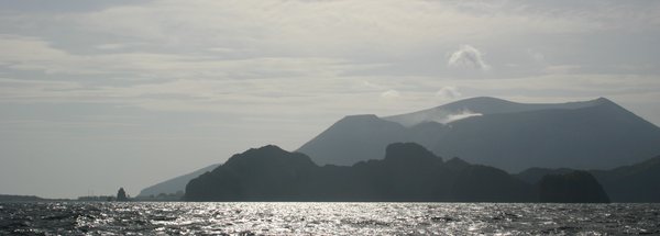 En el horizonte, por popa, todavía se ve la siluata de las Eolias y eso nos hace pensar que no estamos demasiado lejos, ¿cómo tendrán hoy al saco de los vientos los dioses?
