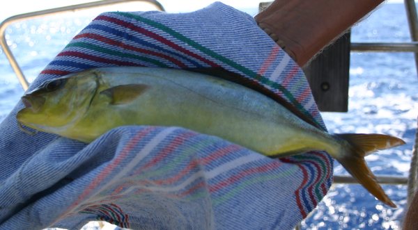 Nos adelanta un pez volador precioso de color azul (no se si todos lo son, es el primero que vemos) con un salto de entre 25 y 30 metros, quizás lo esté persiguiendo un “bonito” y grande depredador que muerda nuestro incansable pulpito de popa…. al rato nuestro cefalópodo de silicona es atacado por una bonita Seriola de 800gr que después de ser limpiada hará el