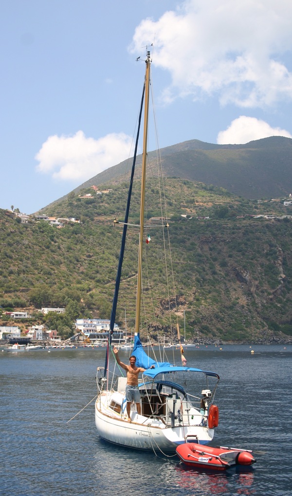 Después de descansar, divertirnos, reponer comida y bebida el 10 de Julio salimos hacia las Eolias. Hemos quedado con Xevi, un Navegante Solitario vecino de Badalona que viene navegando desde Grecia, en Filicudi. No tenemos viento y a motor no corremos mucho. La previsión era que aumentaría pero no… se nos hace tarde y cuando vemos primero Alicudi el sol ya está bajo y se pone llegando a Filicudi. Suerte que los enormes gendarmes del norte de la isla están marcados por un faro, tenemos buenas cartas y el año pasado ya pasamos por aquí. Llegando a la playa, marcada por una potente luz Xevi enciende las suyas y nos guía. Fondeamos a su lado y enseguida viene a nuestro barco a tomar algo para celebrar el encuentro. Orión, su barco, se pone nervioso y comienza, en dirección contraria al resto, a moverse apuntando con su proa a nuestra bañera, parece que también quiera subirse. Tantas son las ganas de saludarnos que tiene que tenemos que separarlo del nuestro empujando con la mano. Decidimos cambiar el fondeo por si por la noche sufre otro arrebato… nos separamos 60 metros, ni que los dos se pongan deacuerdo, llegan. El único inconveniente es que Xevi tendrá que remar más para volver al Orión.Al día siguiente bajamos a tierra a pasear y comprar verduras para preparar un curry a bordo del Luni y por la “tarde”, después de la siesta, café en el Orión, que se alargará charlando hasta la una de la noche, los navegantes solitarios tienen mucho que contar, y ganas de hacerlo