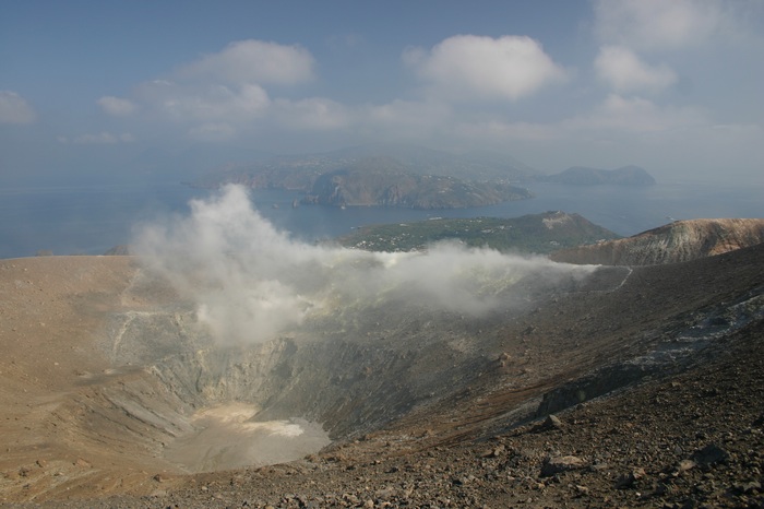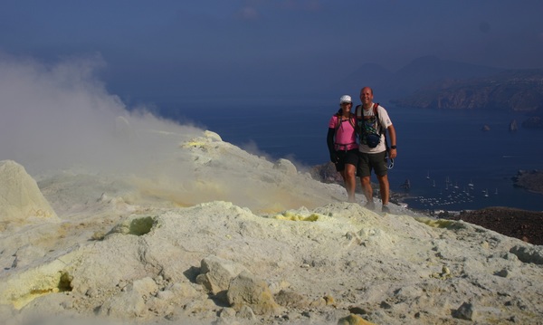 El día siguientene lo pasamos entre baños y paseos por tierra y el 14 de Julio nos levantamos pronto, con la salida del Sol, y bajamos a tierra con calzado correcto y 4 litros de agua, toca subir a Vulcano, la forja de los dioses dónde se construyó, entre otros, el tridente de Neptuno. En una hora subimos sus 390 metros, no es difícil, camino de arena y la única complicación es, en el último tramo, sortear las chimeneas