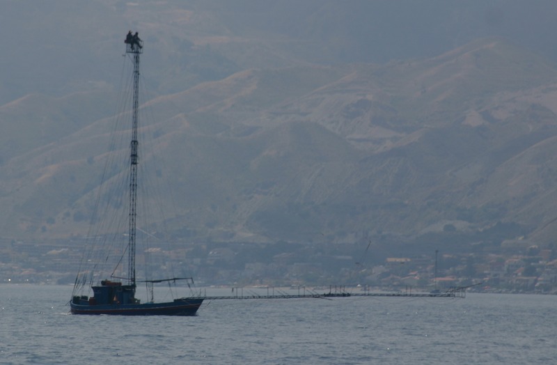 los dos de pasajeros que inicia la maniobra de salida acompañado del práctico, tres barcos pescando peces espada… esto se anima, nos encontraremos todos en el centro y nosotros ya vamos a 8 nudos, NO queremos ni imaginarnos que debe ser cruzar este estrecho de subida, haciendo bordos y esquivando a todos….Pasamos este cruce todo lo rápido que podemos y comenzamos, una milla más al sur, a cruzar hacia Calabria.