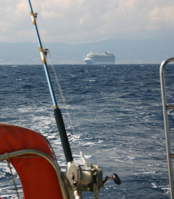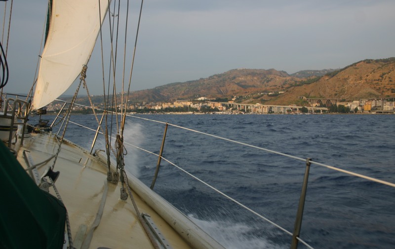 da nombre al estrecho) y su puerto con dos grandes barcos de pasajeros, esto se anima. No sabemos como pero el viento ya está a 18 nudos, y el estrechamiento del canal hace aumentar la corriente, ya vamos a 7 nudos y delante contamos tres ferries cruzando de Sicilia al continente en las dos direcciones, un gran mercante subiendo el estrecho y uno de
