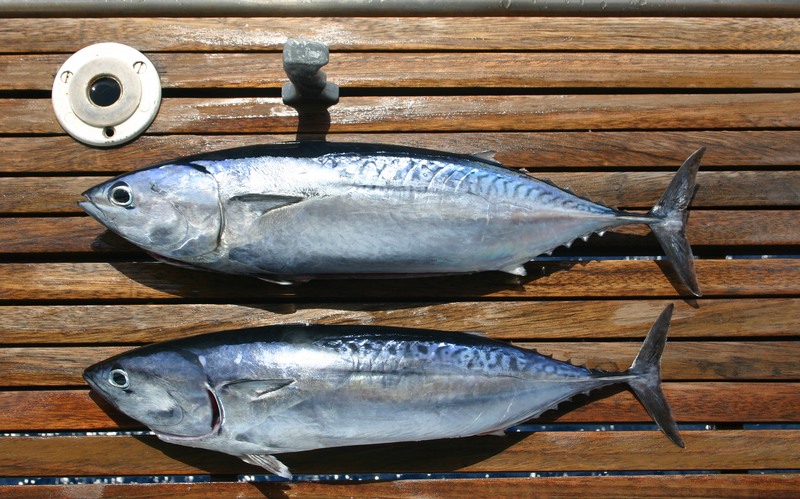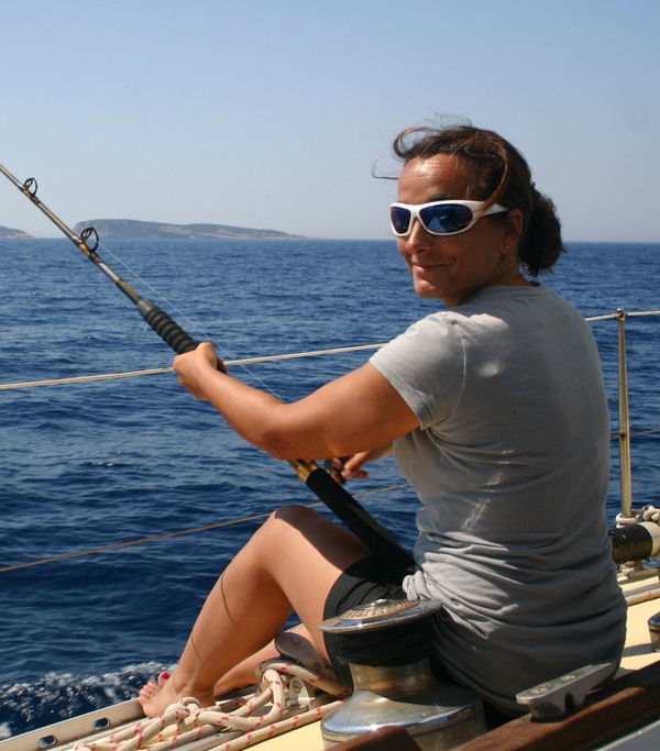 El viento viene de tierra lo que nos permite ceñir muy rápido y sin ola, esto es genial. Llevamos las dos líneas de pesca tiradas, en 1.100 millas no hemos sacado nada comestible del mar, cuando de repente, en la de la Capitana, parece que a picado algo…. después de pelear un rato saca una melva de unos 800 gr, rápidamente vuelve a tirar el anzuelo, ya tenemos