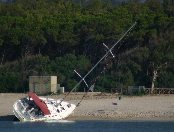 Vemos un mástil y nos acercamos, terrible, es el de un velero de 50 pies que está varado en la playa. Parece imposible con la calma que reina en estos momentos que algún temporal lo haya podido tirar a la arena. Nos quedamos a 350 metros de la costa con una sonda de 5m.