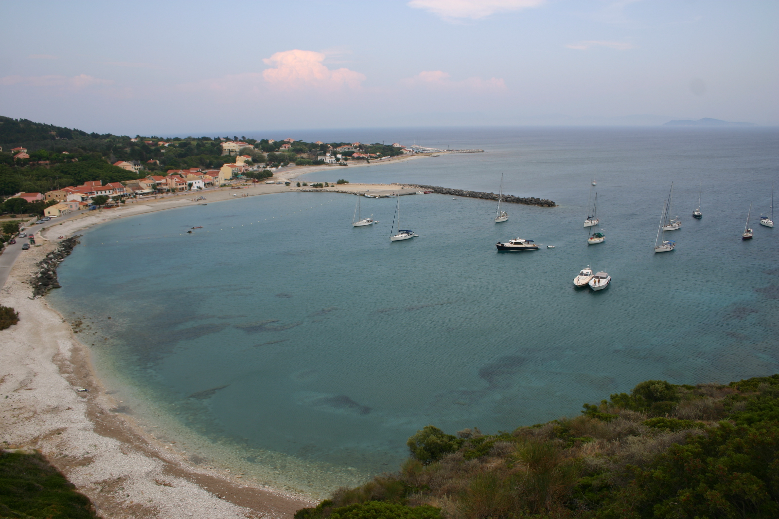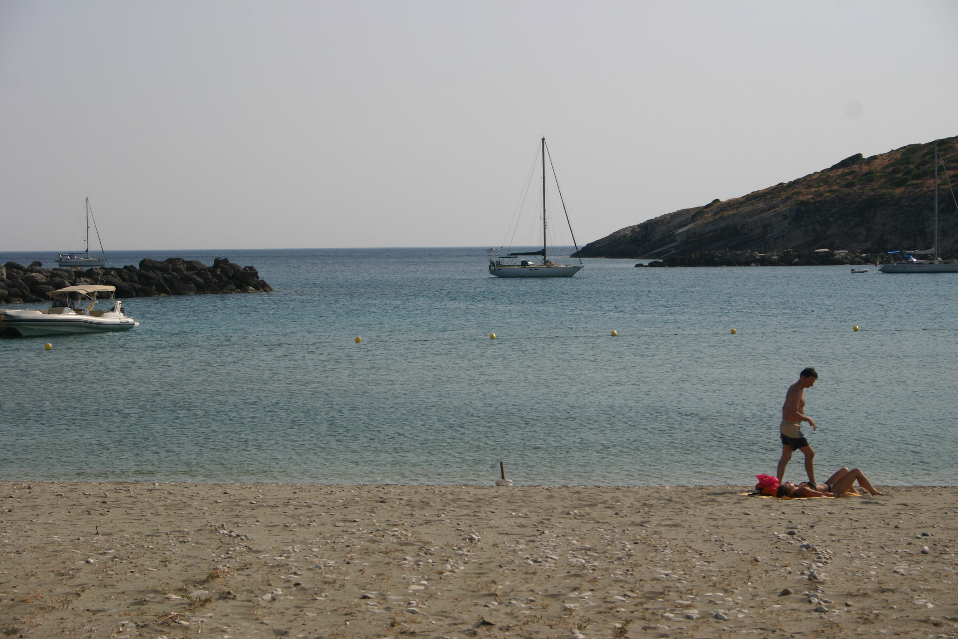 Fondeamos a 4 metros sobre arena y, con el motor todavía caliente, saltamos al agua. Vamos buceando hasta las rocas que rodean un pequeño islote, el agua está cristalina y llena de vida. Luego nos acercamos nadando a la playa y andando hasta el pequeño puerto de pescadores donde hay también un par de tabernas. Por la tarde comienzan a llegar veleros, el puerto también es punto de encuentro de charters, al final hay unos 25 barcos fondeados.