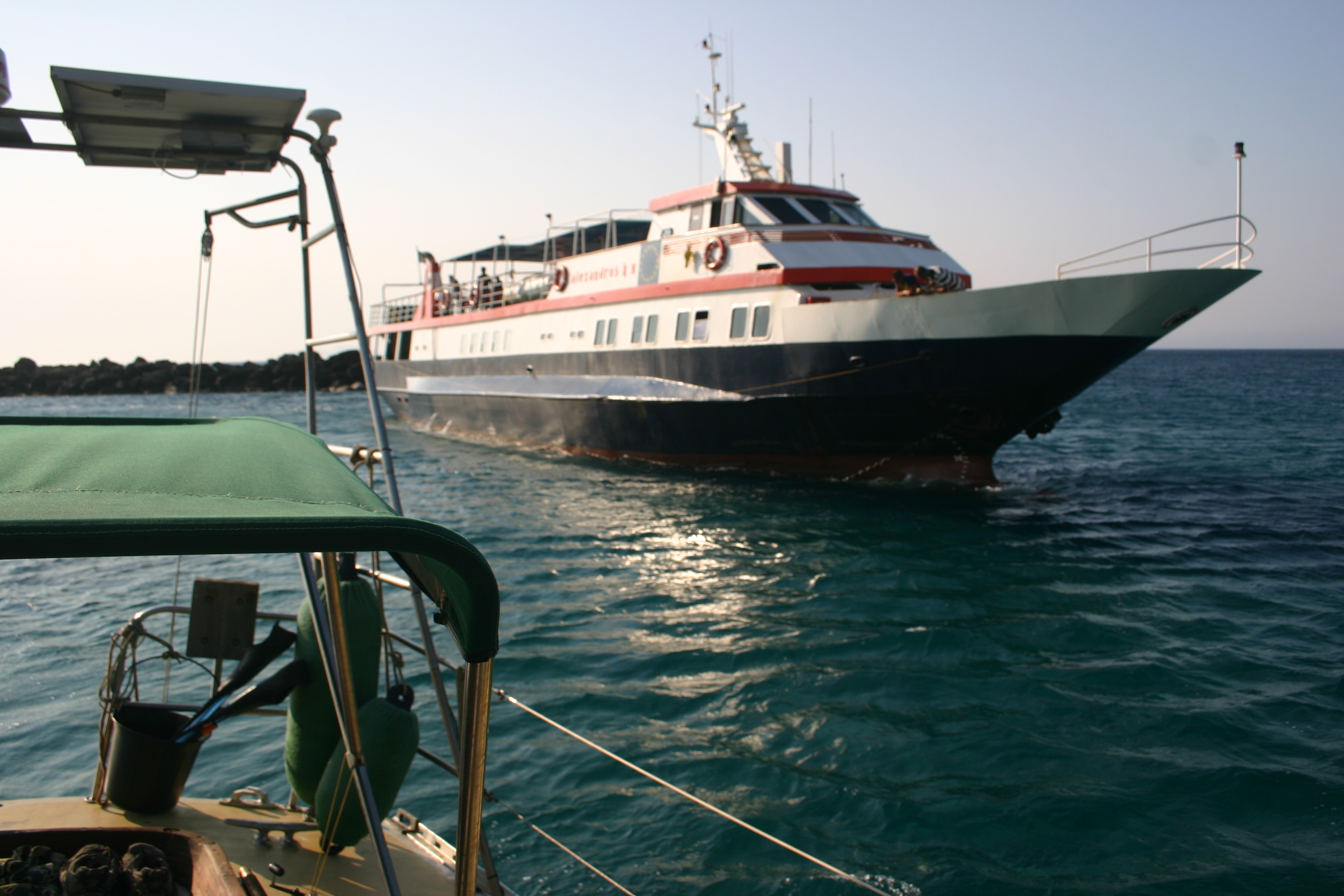descansar un rato más. Cuando nos despertamos en la rada hay 8 ó 9 barcos más, oímos una sirena, son las siete y vemos como se acerca un gran ferri, el Alexandros III. Algunos corren a levantar su ancla, otros dan avante para apartarse y el ferri que avanza sin dejar de hacer sonar su sirena, suerte que nos avisaron a tiempo. El gran ferri apunta a nuestra popa, nosotros encendemos el motor por si acaso hay que huir, justo antes de abordarnos para, deja caer a escasos tres metros de nosotros su enorme ancla y comienza a retroceder hasta el muelle que está a 50 metros dónde se amarra con cabos a tierra para pasar la noche, mañana carga de nuevo pasaje y marcha. Vaya experiencia, y que control tienen!