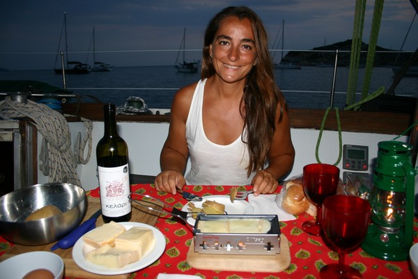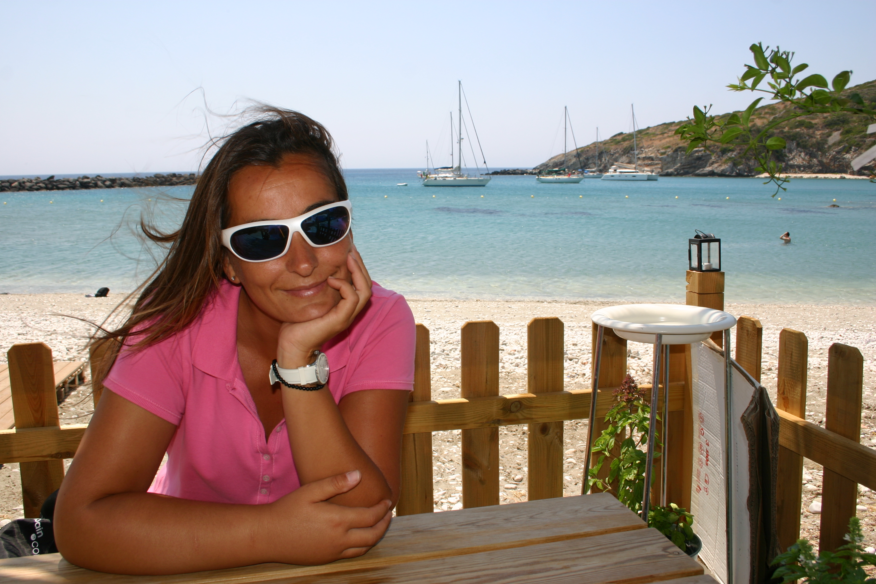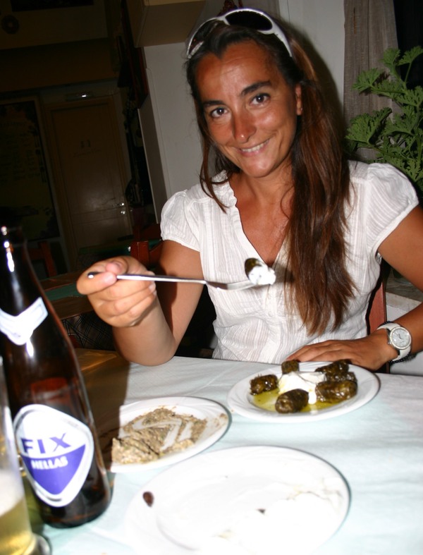 Los platos están buenísimos y los dueños son encantadores, entendemos perfectamente el significado de “Siga Siga”, estamos acabando la comida cuando nos llama Sophie que ya ha aterrizado. Salimos corriendo y llegamos al embarcadero donde está nuestro gomone al mismo tiempo que ella.Después de mucho tiempo de haberlo planeado, por fin podemos navegar con ella por aguas Helénicas.