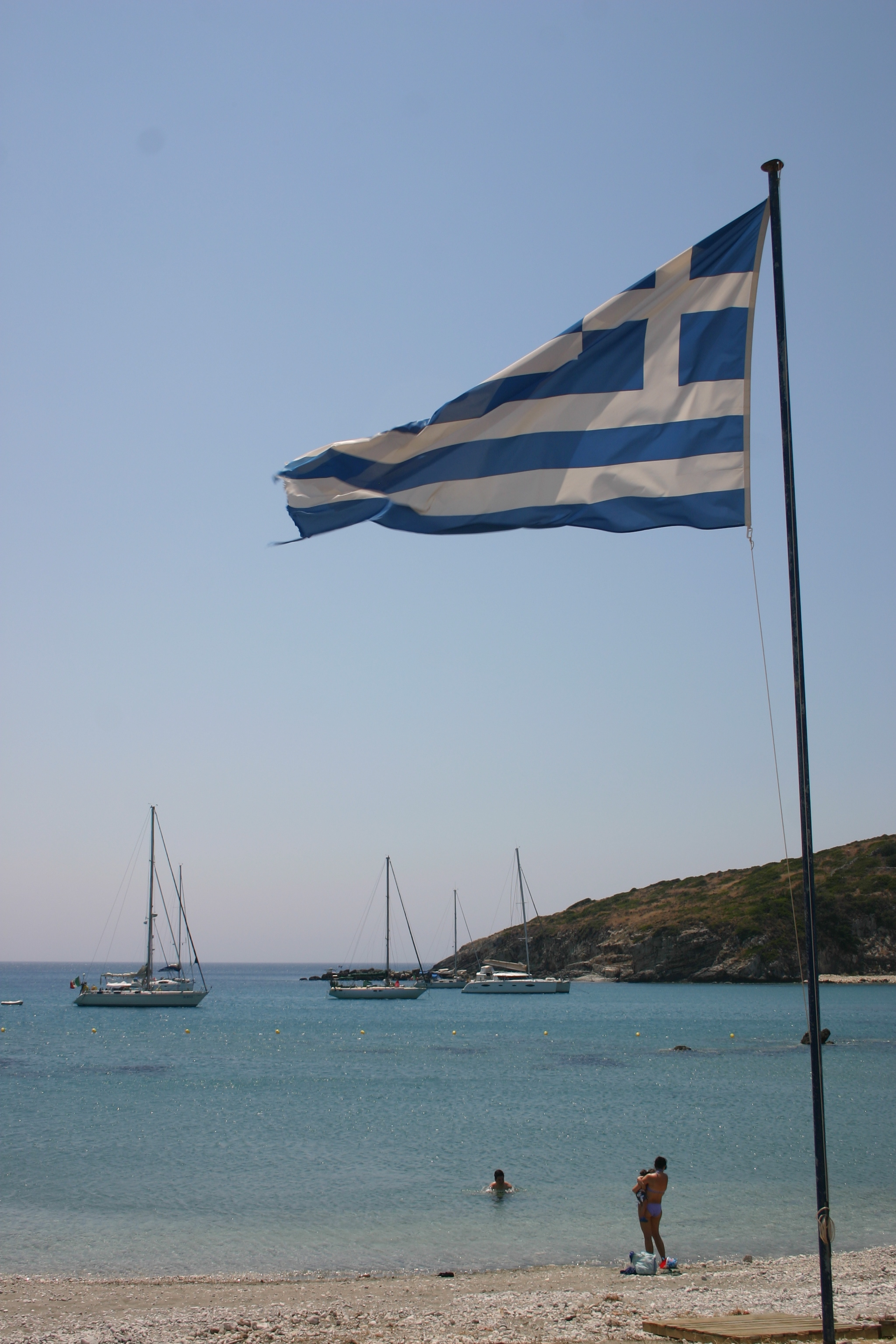 Con Sophie ya instalada pasamos el 26 de Julio entre compras de comida, persiguiendo souvlakis móviles, de taberna en taberna (tzatziki, taramosalata, moussaka, pastitzata, hellenica salata, Mythos, etc), poniéndonos al día de todo e izando la bandera que le pedimos nos trajera.