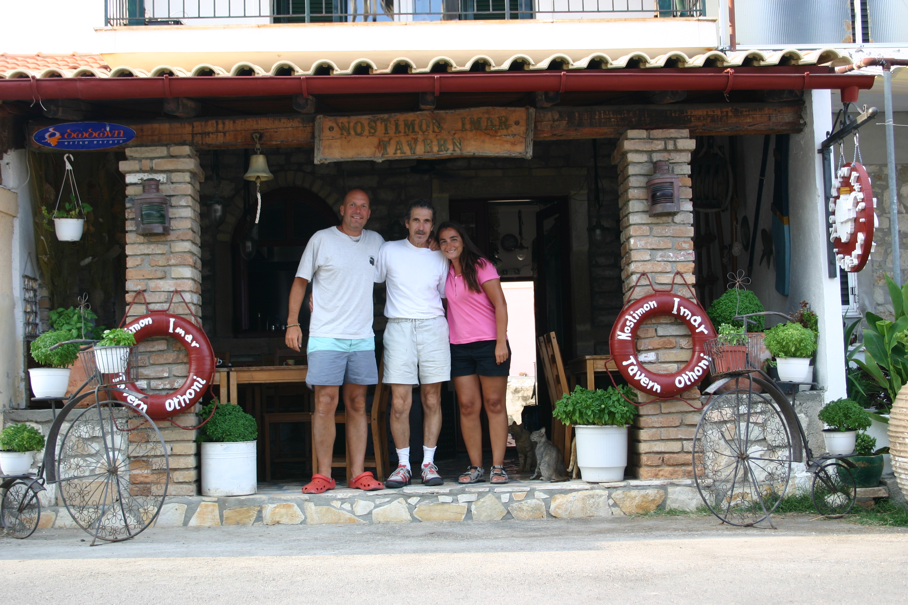 Babi, la persona que la regenta resulta ser muy simpático además de buen cocinero, entramos en la cocina y nos enseña el pescado que acaba de entrar en la cocina, un excelente ejemplar de dentón, pedimos para dos personas y nos saca tres “chuletones” que no los he visto tan grandes ni de buey en el País Vasco. Está buenísimo y entre la comida y la charla luego con Babi se nos hacen las cinco de la tarde, momento en que se levanta y nos dice que nos quedemos al cargo de la taverna (estamos sólos) que el tiene que irse un momento. Cuando vuele no parece muy contento, ha ido en bicicleta al puerto y los pescadores no han traido nada que le sirva. En la rada dónde estamos fondeados acaban de entrar dos pescadores que no son de la zona, le proponemos acercarnos con nuestro gomone para ver que tienen, después de charlar un rato con ellos consigue que le vendan un mero de 7Kg, que bajamos a tierra haciendo equilibrios en el dingui. Acabamos la tarde en la terraza de Babi, todos contentos, tomando un Frappe Megala Glico.