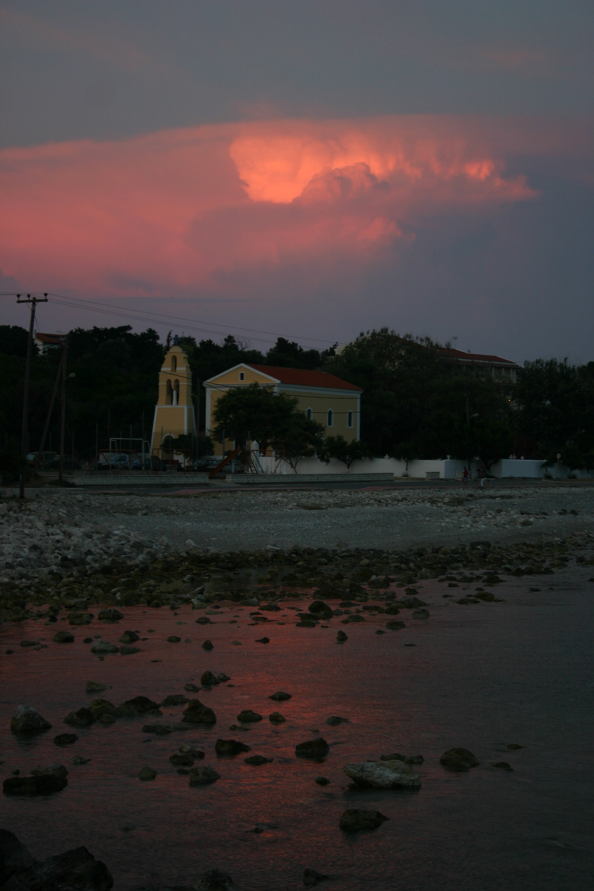 Llegamos al extremo NE, tenemos delante la costa de Albania y por nuestro estribor se abre el estrecho que la separa de estas islas Griegas, la corriente dirección sur es fuerte y comenzamos a correr, nada que envidiar del Estrecho de Messina.El sol está bajo y comenzamos a buscar un sitio para fondear. Entramos en Órmos (bahía) Imerolia, en el sitio resguardado del viento predominante hay tres grandes barcos de hierro varados y oxidados, salimos. Entramos Kassiopi, está lleno de barcos y no podemos fondear. Continuamos por la costa hasta Órmos Galiates, no hay nadie, nos situamos al oeste y dejamos caer el ancla, garrea, levantamos y segundo intento, me tiro al agua y veo que está lleno de alga y el ancla no se coge, levamos y vamos al otro extremo de la playa, en el que todavía hay sol, también garrea y cuando la sacamos del agua está llena de algas, nos vamos. Encendemos las luces de navegación, el Sol ya se ha puesto, y seguimos. Pasamos entre Nisos Kerkira y