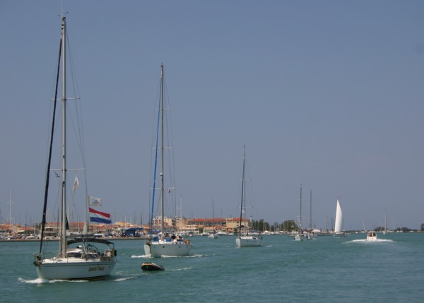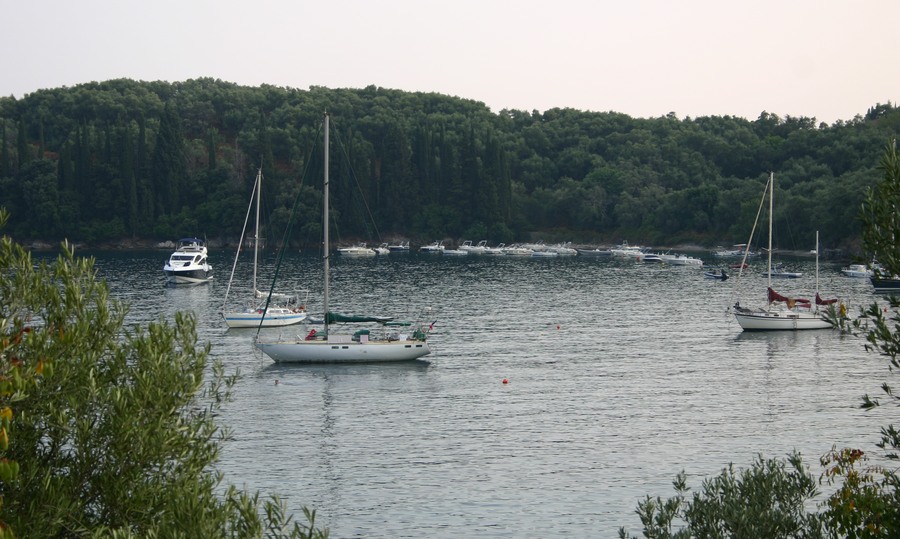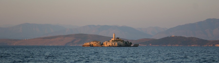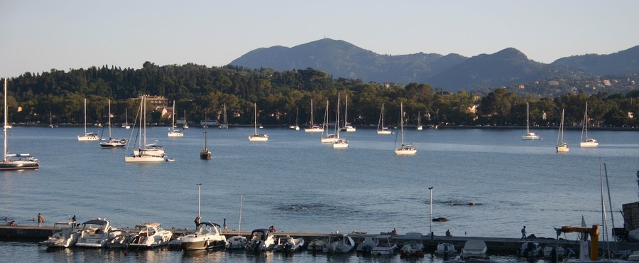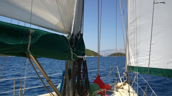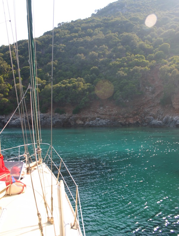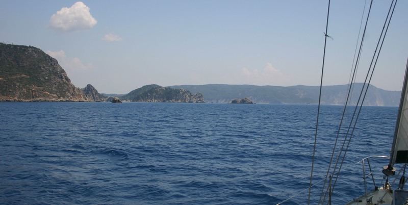 o y oh! sorpresa, no todos los veleros han encendido su luz de fondeo. Buscamos un buen sitio y tiramos el hierro, se coge a la primera, bañito, cena y a dormir.El 25 de Julio prontito levantamos el fondeo después de desayunar y continuamos al sur. Tenemos algo de viento y cruzamos a vela la gran bahía al norte de Akhropolis Corfú. Por el camino y con los prismáticos vemos