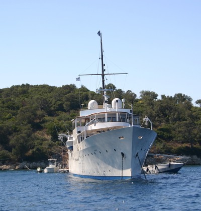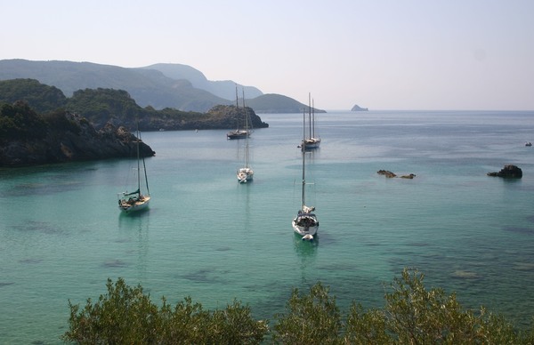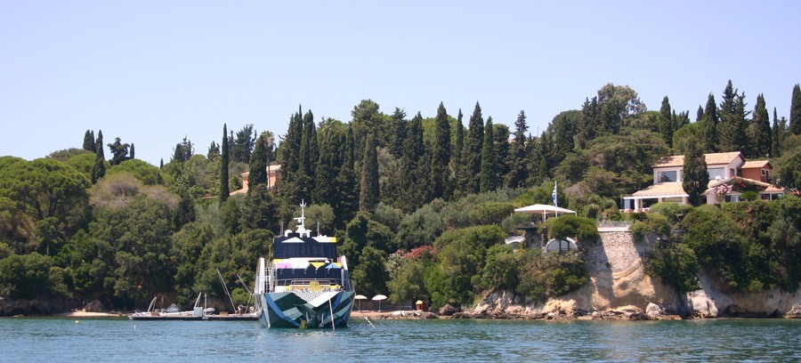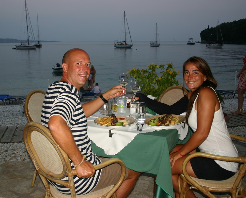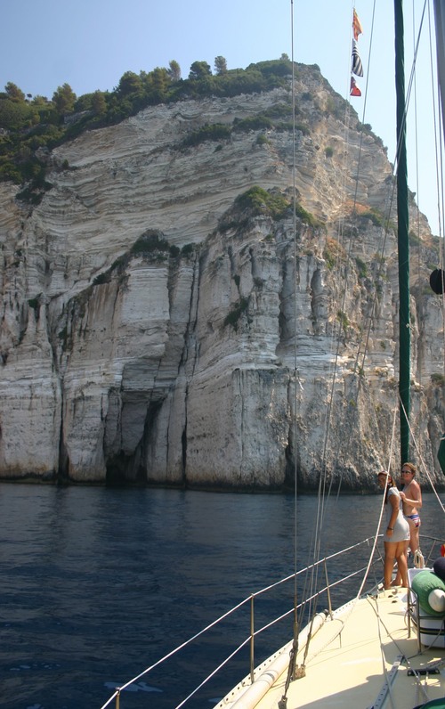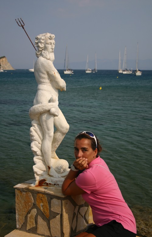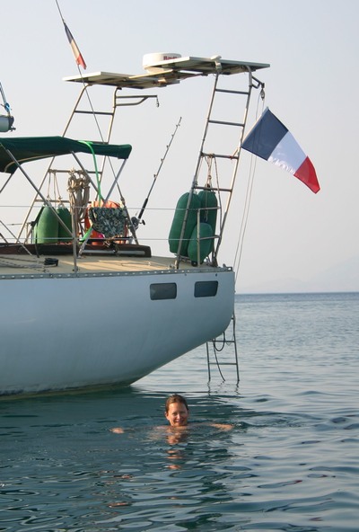 el fondeo y retirarse más hacia el W. Luego, comienza a acercarse a nosotro y nosotros a el, no entendemos nada, pero como el ha sido el primero en llegar somos nosotros los que debemos hacer algo, pero que, tenemos los escollos cerca y no nos podemos apartar. Decidimos fondear una segunda ancla con el dinghi (neumática auxiliar) por popa para mantenernos separados de él y seguros suficientemente lejos de las rocas, así pasamos la noche.El 24 de Julio y después de un paseo por el pueblo levamos anclas (tenemos dos en el fondo). Andrea vuelve a las islas del Norte y nosotros comenzamos a bordear la isla de Kérkira dirección a la capital, el 28 recibimos visita!