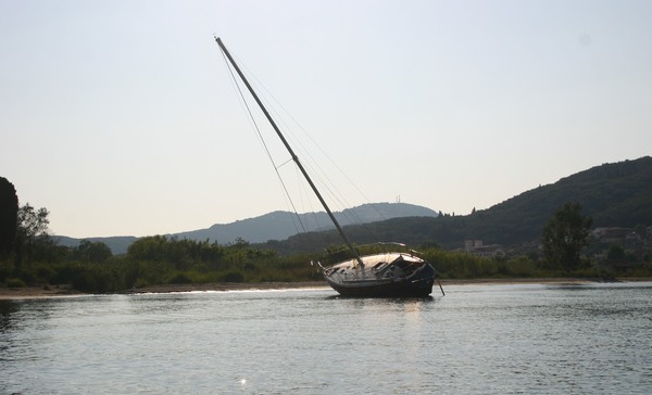 El día siguiente nos levantamos pronto y mientras estoy preparando el desayuno Sophie comienza con una tradición que no dejará en todo el viaje, saltar al agua a por el primer bañito del día…. Levamos el ancla y ponemos rumbo Sur, el viento es muy suave y avanzamos lentos ayudados por el motor rumbo a Nisoi Paxoí. A medio día el viento para completamente y el calor se hace insufrible, abandonamos nuestra derrota y nos acercamos a la costa. Vemos una playita al lado de un pequeño puerto con un par de veleros fondeados, nos acercamos y además vemos un gran velero de hierro varado en la playa, no nos acercamos ya que la carta marca bajos de roca y poca profundidad.