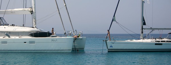 Al día siguiente bajamos a tierra para comprar comida, todas las etiquetas escritas en griego, no será fácil. Compramos feta, yogur, unos tomates enormes y un montón más de fruta y verdura. De regreso al barco pasamos por delante de una taverna que nos gusta, volveremos. Cargamos la despensa y nos bañamos.Cargamos de gasolina nuestro Gomone y nos vamos a visitar la costa con destino las playas que vimos cuando llegamos. Salimos de la rada y el paisaje es brutal, blancos acantilados hasta el mar, olivos y cipreses por las laderas y el agua de un azul profundo que cambia a verde cerca de las rocas. Entramos en una cueva, la luz se filtra por debajo de las rocas, se ve el fondo de arena y su reflejo en el techo, precioso. Llegamos a la playa de arena accesible sólo por el mar, está rodeada por altas paredes de roca, atamos el auxiliar a una roca del fondo y llegamos nadando con los patos y las gafas, el fondo de roca y arena lleno de peces de colores, fuera nadie, es para nosotros solos.