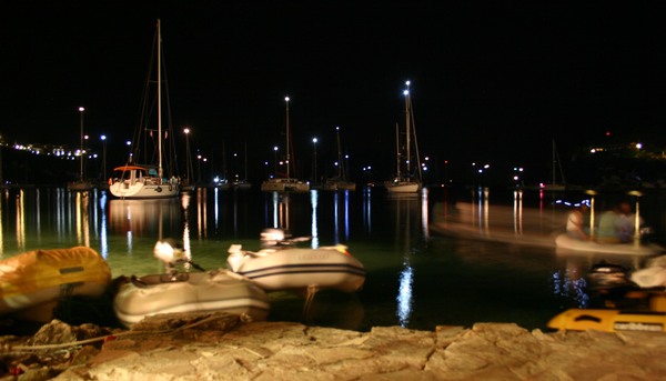 de fondeo en una bahía de menos de una milla por media milla, bajamos a tierra con el gomone para pasear y cenar algo. A la vuelta el viento, que ordena los fondeos, ha parado y cada barco mira donde quiere según el capricho de una extraña corriente que por aquí circula, curiosamente nadie se toca, nos vamos a la cama después de comprobar que las dos botellas están en su sitio y de que ningún cabo toca el agua….
