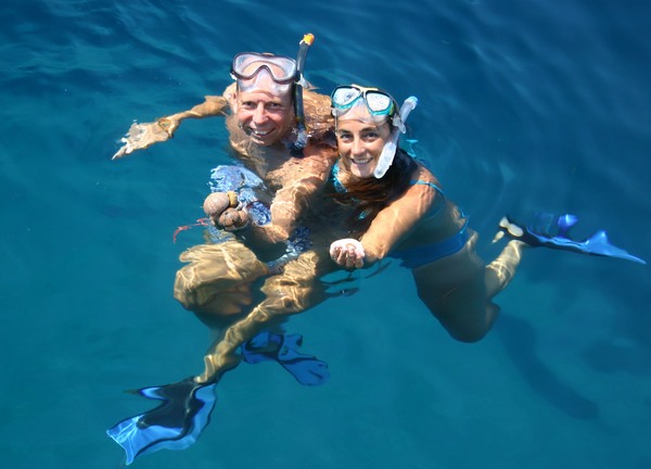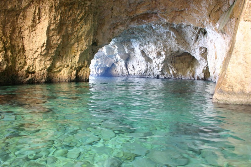 Cargamos de gasolina nuestro Gomone y nos vamos a visitar la costa con destino las playas que vimos cuando llegamos. Salimos de la rada y el paisaje es brutal, blancos acantilados hasta el mar, olivos y cipreses por las laderas y el agua de un azul profundo que cambia a verde cerca de las rocas. Entramos en una cueva, la luz se filtra por debajo de las rocas, se ve el fondo de arena y su reflejo en el techo, precioso. Llegamos a la playa de arena accesible sólo por el mar, está rodeada por altas paredes de roca, atamos el auxiliar a una roca del fondo y llegamos nadando con los patos y las gafas, el fondo de roca y arena lleno de peces de colores, fuera nadie, es para nosotros solos.
