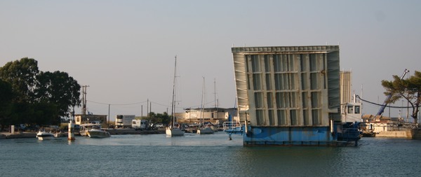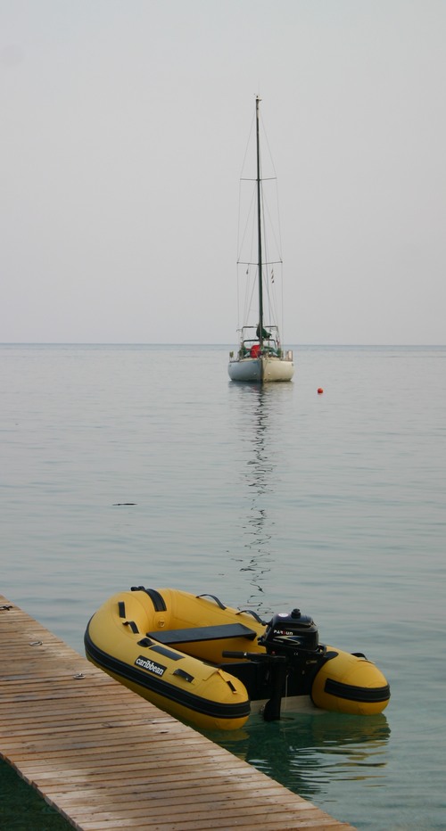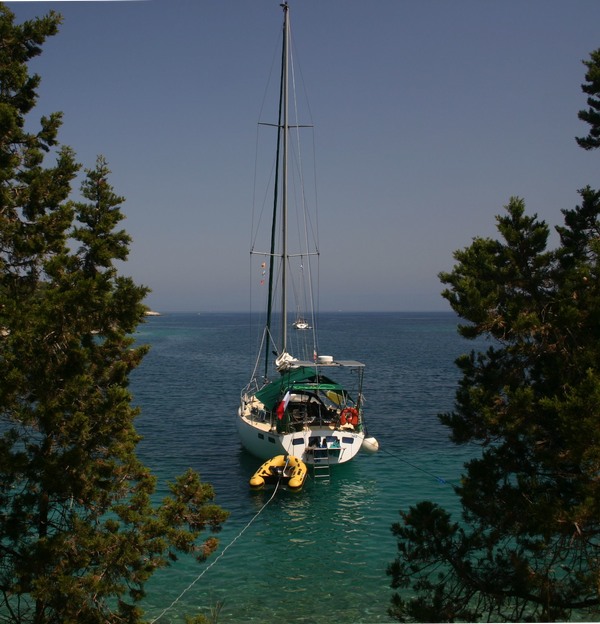Dejamos caer el ancla a 4m sobre arena dentro de la rada y protegidos por el dique, no sea que además del viento que marca la guía también entre algo de Sur. Me tiro al agua, que calentita que está, para ver el ancla como de costumbre, más por bañarme que por otra cosa ya que desde cubierta se ve perfectamente el ancla clavada y que no hay peligros alrededor.Inflamos el Gomone (como llaman los italianos al auxiliar) y bajamos a tierra, ya estamos en Grecia.