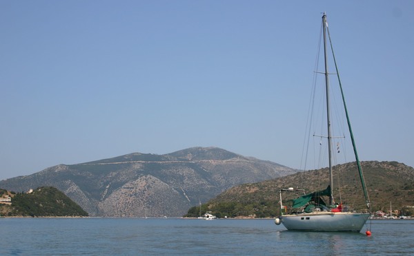 El 3 de Agosto levamos ancla y seguimos nuestra ruta hacia el sur. Vamos bordeando Nisos Ithaki y disfrutando de los bellos paisajes, detrás de cada roca se abre una pequeña cala, unas de blanca arena, otras de verticales acantilados, todas decoradas con olivos, cipreses y el canto de mil cigarras (sirenas diciéndonos que nos quedemos las tenemos continuamente dentro de la cabeza). Entramos en una gran bahía y al fondo vemos una pequeña isla que casi no aparece en las cartas, la bordeamos y nos encontramos un pequeño pantalán con dos veleros abarloados, nosotros también