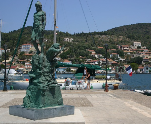 El último día hacemos una gran compra, tres carros del supermercado local, los bajamos hasta la estatua de Ulises y vamos a buscar el velero, levantamos el fondeo y nos abarloamos junto al héroe mitológico para cargar la compra. Aquí los puertos son lo que deberían ser, un lugar de abrigo donde amarrarse si es necesario, aquí no cobran nada por eso, una lección que han olvidado nuestros dirigentes que sólo miran por la recaudación y su bolsillo!!!! que pereza/pena volver a navegar por nuestra costa tan mal gestionada y con tan pocos puertos marineros.