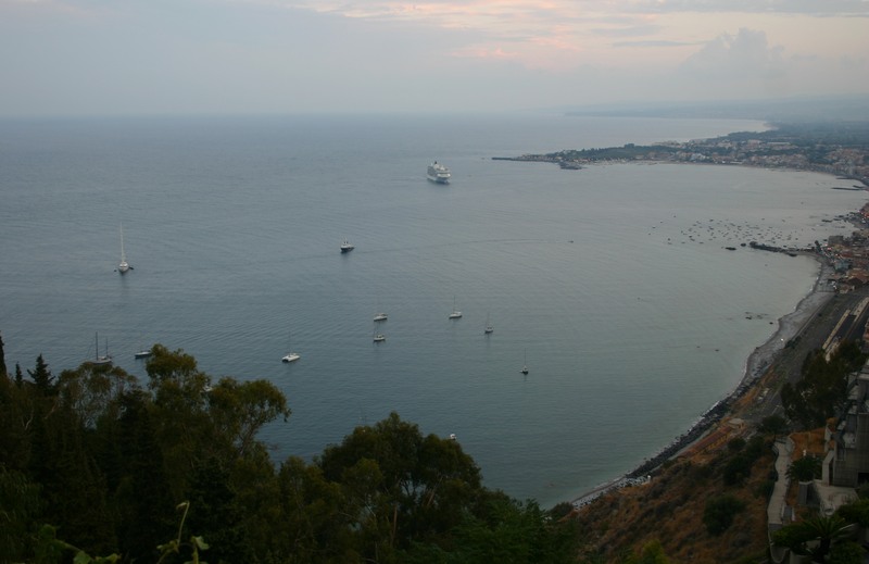 sabe cuando llegarán sus compañeros. Recogemos y “desnavegamos” el camino hecho rumbo Norte, donde dejamos caer el ancla justo debajo de Taormina. Inflamos el gomone y bajamos a tierra a inspeccionar. Vemos tiendas y también la parada de autobús que nos llevará a lo alto de la colina. Con puntualidad suiza se presenta el autobús, cómodo y barato, subimos a Taormina. Cuando podemos escapar del bullicio turístico encontramos una zona más tranquila con bonitas vistas al sur, paseamos y callejeando llegamos a la parte más alta del pueblo. En un castillo reconvertido, una agradable pizzeria, entramos y nos sorprendemos con lo bonito del lugar, trato agradable y pizzas exquisitas, Villa Zucca, muy recomendable. Bajamos paseando hasta la parada de autobuses y de ahí a la Giardini Naxos dónde tenemos el gomone abandonado en una playa.El día siguiente se despierta nublado pero tranquilo, bajamos a tierra para hacer las compras, hemos consultado las mareas y no tenemos la corriente de subida hasta las 13 horas.