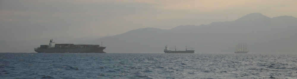 Nos giramos para despedirnos y no vemos las luces de Messina ni de la costa occidental del estrecho. Sólo una pequeña luz verde. Luego una blanca. Luego a estas dos se les suma una roja, las tres muy separadas, parece que no tengan nada que ver las unas con las otras de lo separadas que están. De repente el estruendo de una potente bocina nos saca de dudas, es un gran carguero, vemos como las olas rompen en su proa, damos 50 grados a estribor, dejamos de ceñir hacia la salida y nos vamos rápidamente hacia un lado con el viento de tr