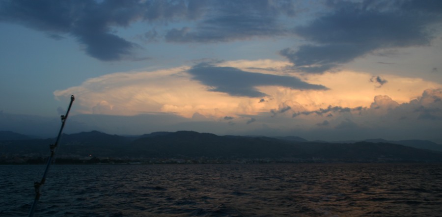 Por suerte no hay tráfico y después de esquivar un cargo nos encontramos a medio camino, por proa, dónde antes estaba majestuoso el Etna ahora hay una gran nube y como si de un faro se tratase, nos indica, con rayos, la dirección que debemos seguir. Recogemos la caña, ni los peces, con su mirada carente de inteligencia, creo que se hayan quedado hoy por aquí. Preparamos los trajes de agua y mientras miramos el cielo esperando agua dulce, zas, una ola de tres metros nos rompe en cubierta llevandose el último sabor que nos quedaba de la mermelada. El viento está a 35 nudos y cogemos el tercer (y último) rizo, el GPS no baja de 6,5 nudos quedándose casi todo el rato a 7 nudos de velocidad.